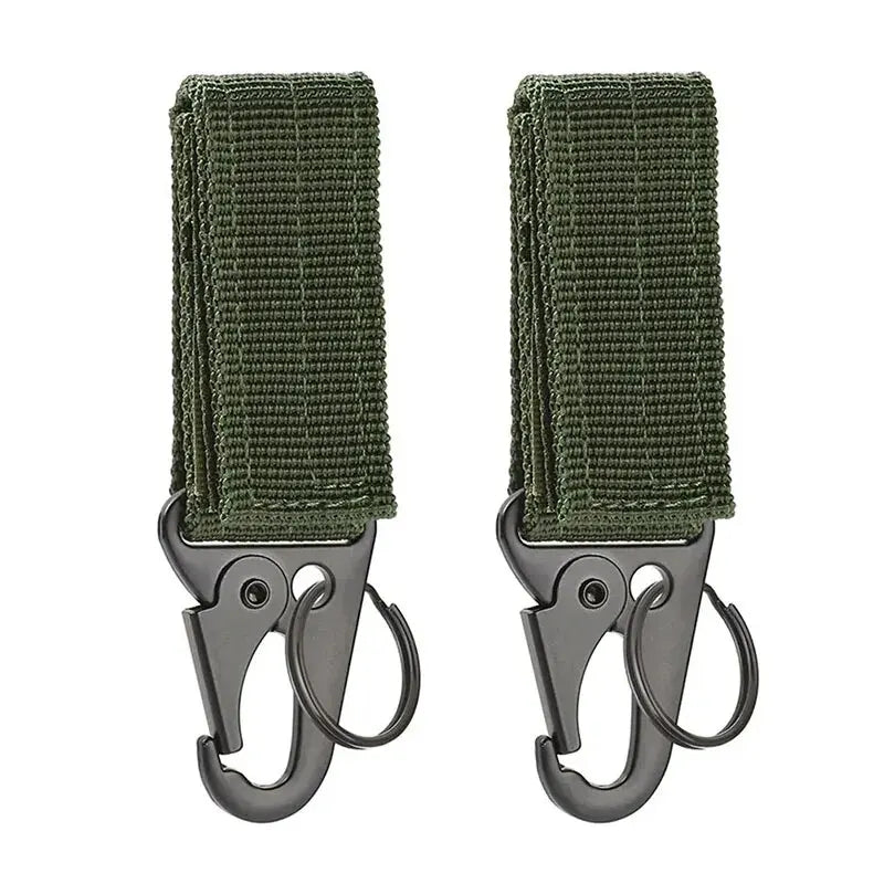 The 2pcs Tactical Hanging Buckle Molle Nylon Webbing Carabiner Belt features a robust tactical design, ideal for outdoor activities like climbing and camping.